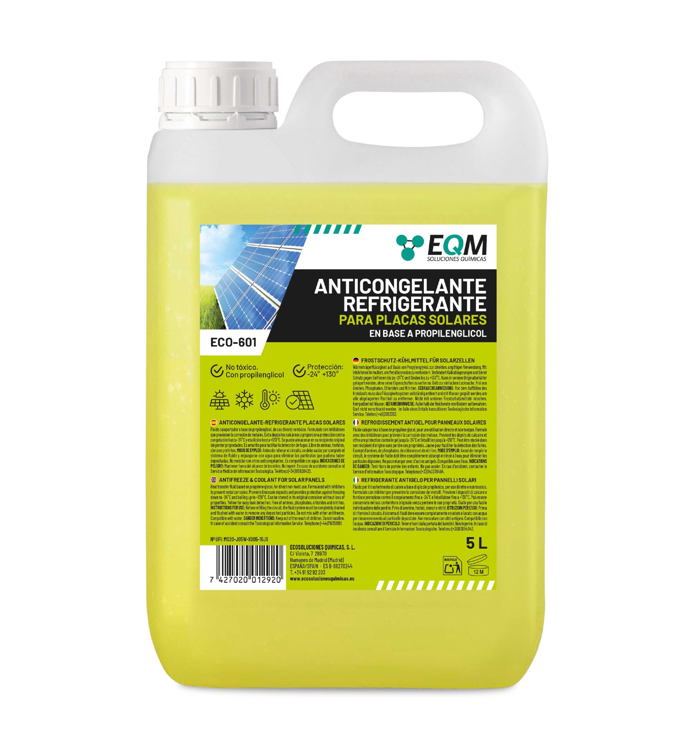 ANTICONGELANTE-REFRIGERANTE DE USO DIRECTO, NO TÓXICO, A BASE DE PROPILENGLICOL. Este producto está diseñado para instalaciones de energía solar y circuitos que requieren baja toxicidad. Con una concentración de propilenglicol al 40%, ofrece protección en un rango de temperaturas de -24 ºC a 130 ºC.