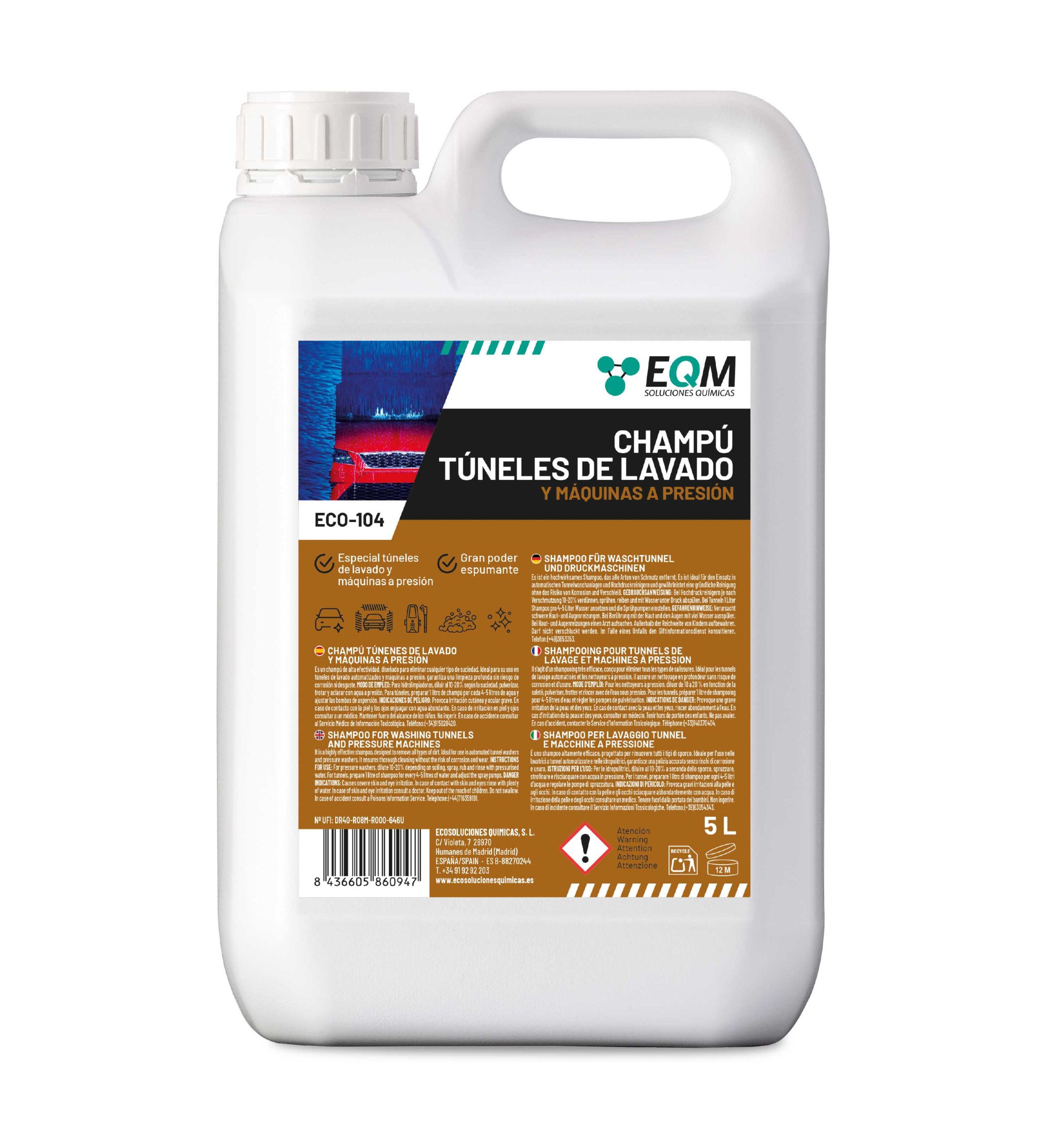 🔘 Aplicación: cargar la solución diluida en el sistema de dosificación del túnel. Asegurar que el equipo distribuya el champú de manera uniforme sobre la carrocería.