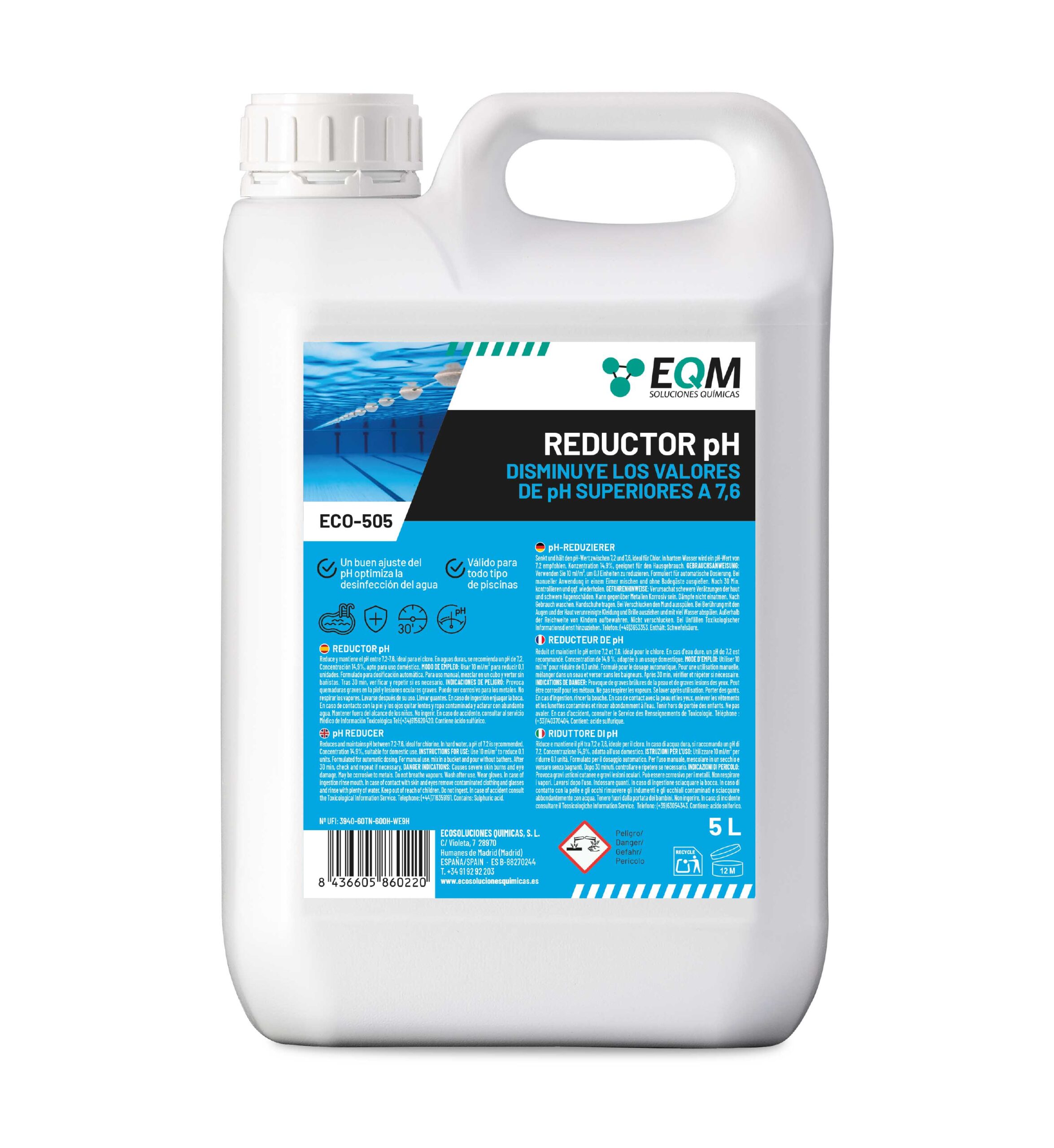 CON ECO-505 EVITARÁS DESEQUILIBRIOS EN EL AGUA Y GARANTIZARÁS LA EFECTIVIDAD DEL CLORO. Este producto ajusta el pH del agua cuando supera 7,6, asegurando que el cloro funcione de manera óptima.